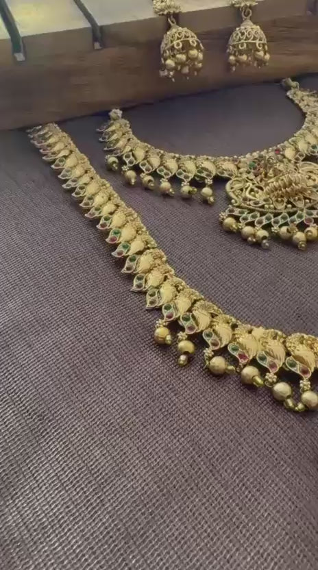 This exquisite temple-work ensemble features a majestic Choker paired with a grand Haram (long necklace). Handcrafted with intricate deity motifs and the soulful artistry of antique gold, the set is embellished with classic red kemp stones and delicate pearl droplets. Perfectly designed to grace a rich Kasavu saree, this collection brings the timeless elegance and "Aishwarya" of the temple sanctum to your wedding day.